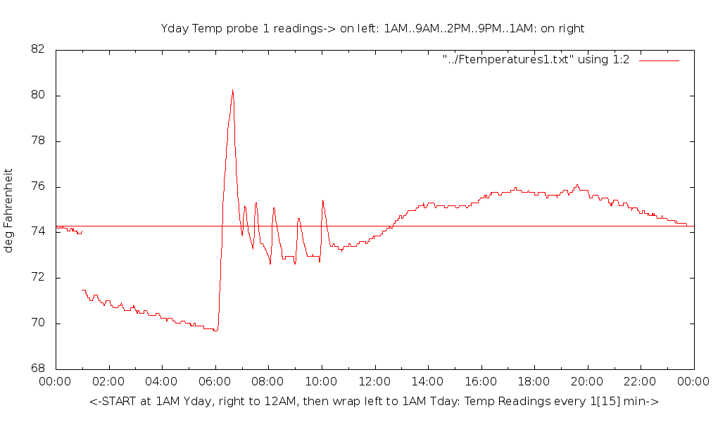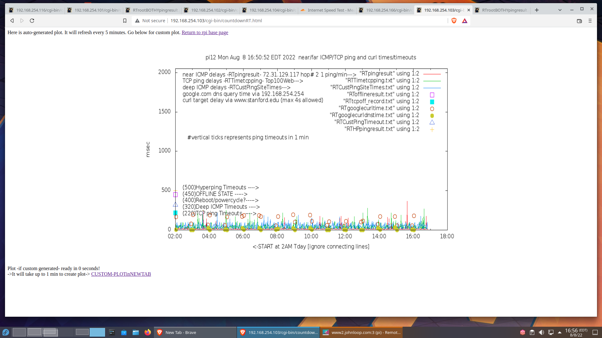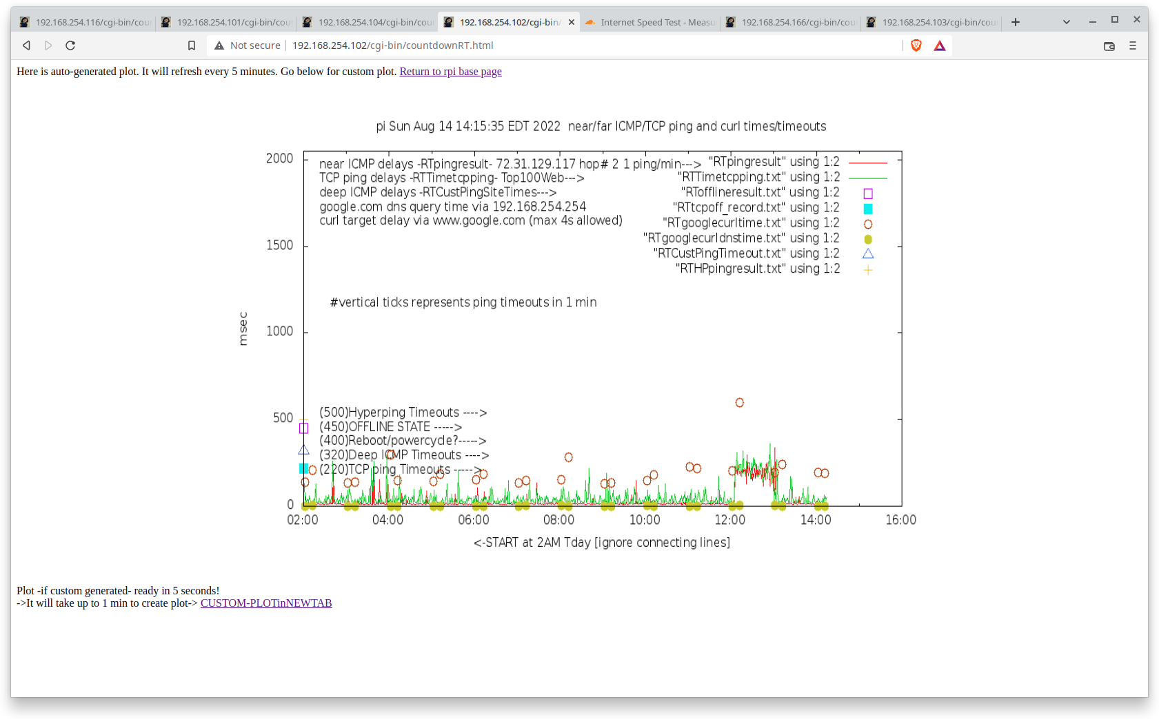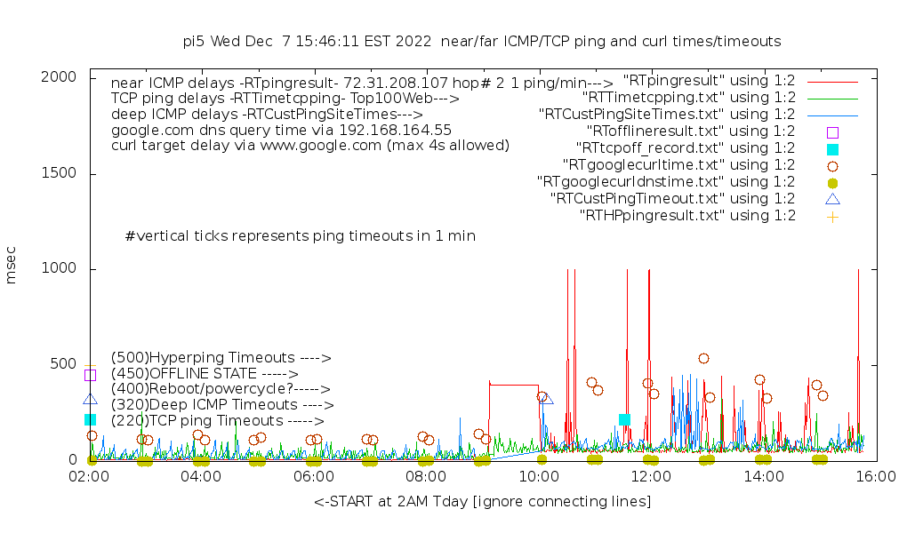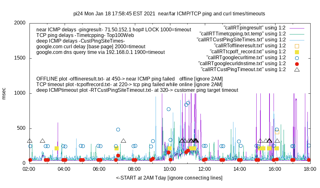 3. I have a list of the "top 100 Web sites" and the RPi will do a round-robin "TCP ping" of them, one site per minute. This does a DNS query, most likely to your router, which is probably doing DNS caching, before it does the response because it pulls the most data. This curl target is configurable on the RPi web page. This is actually a "half open" SYN, not a full TCP handshake. It amounts to about 5 packets total each minute. These TCP pings most likely are to the nearest CDN [content delivery network]! I plot these times, as well as declare a "tcp offline" -- you can see these square blobs on the plot. Unlike the above two pings, which are called from cron, this is free-running from boot [once Internet is acquired] 23 hours a day. The plot will be from 2AM-1AM the next day. This is meant to be a very rough indication of the Internet [including DNS] beyond your ISP.